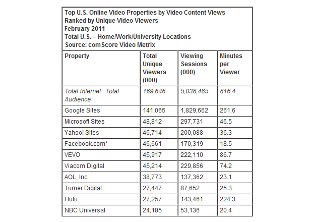 Google Sites (read: YouTube) again ranked as the top online video content property in February, with an impressive 141.1 million unique viewers.