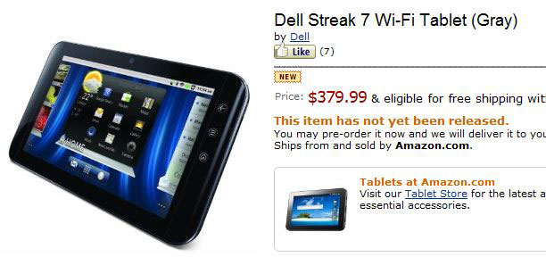 All signs are pointing to a 3G-less Dell Streak. The device as recently certified by the Wi-Fi Alliance and then as if on cue, Amazon posts the pre-order product page. The retailer lists the new model for $379, which works out to be $70 less than the off-contract price of its older 3G counterpart and of course does not require any monthly cellular fees. But everything else is apparently the same. According to the Amazon page, the WiFi-only model still has 16GB of storage, WiFi, Bluetooth, GPS, front-facing 1.3MP camera, with Android 2.2 at the core. So really, the only question concerns the release date. When?