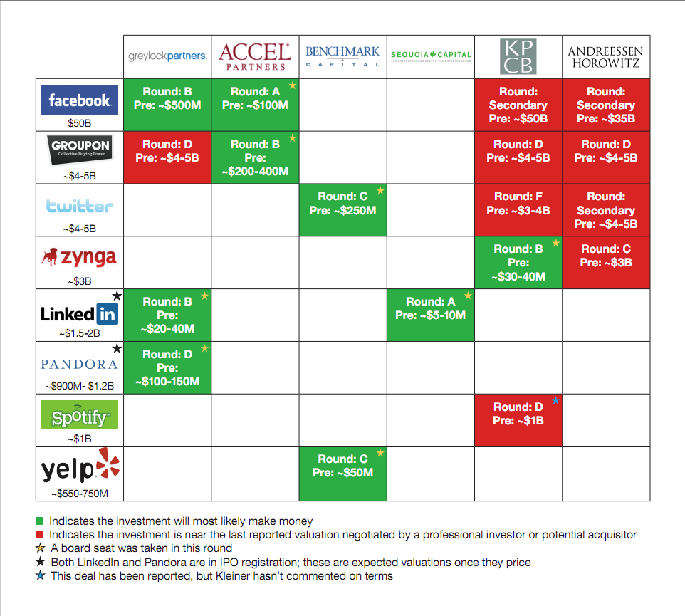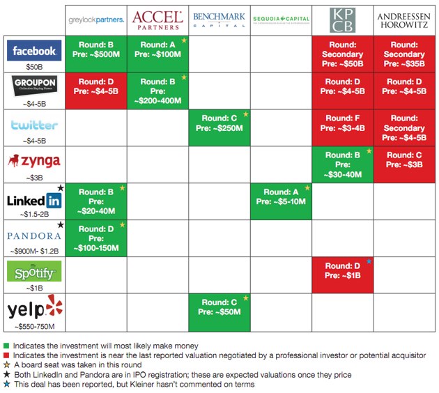 Below is a graph of arguably the top Valley VCs, which of the big Internet companies they invested in, at what price they invested and whether or not they took a board seat in that round (a sign they’re investing time in the company, not just money). Green boxes denote an investment that’s all but certain to return capital; red boxes show investments that are at or near the last professional negotiated valuations and could still prove too heady. Current company valuations are based on negotiated deals with accredited investors or potential acquisitors, not secondary market speculation. Most of the numbers were from published reports or inside sources. (Click to enlarge.)