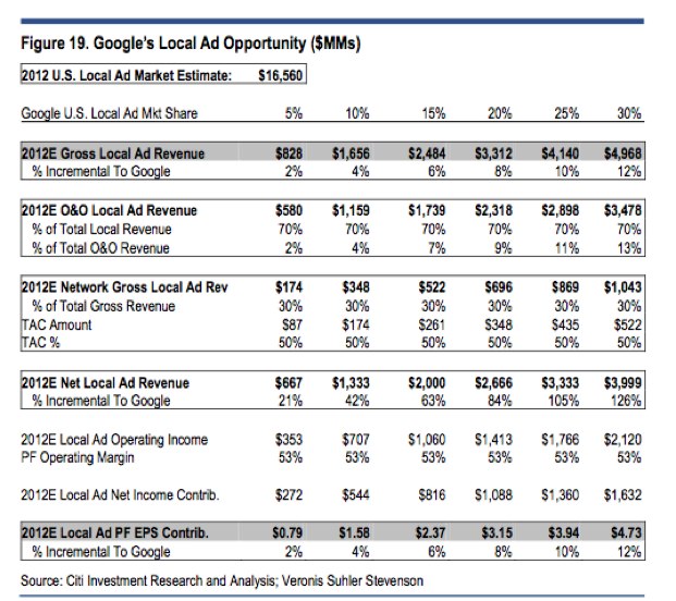 It wouldn’t take much for local search advertising to become another billion-dollar business for Google. Using an estimate of $16.6 billion for the total local online advertising market in the U.S in 2012, Mahaney shows how different scenarios could boost Google’s bottom line. Google only needs to capture 10 percent of that market to add $1.3 billion in incremental net revenue. A 15 percent share would translate to $2 billion in incremental net revenue, and so on (see table below).