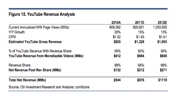 Citi analyst Mark Mahaney breaks down some of Google’s opportunities for new billion-dollar businesses in a new research report he released this morning. In particular, he focuses on two of Google’s most promising growth opportunities: YouTube and local advertising. According to his estimates, YouTube’s gross revenues hit $825 million in 2010, and will reach $1.3 billion in 2011 and $1.7 billion in 2012. After stripping out revenue share, the net revenue contribution Google will get to keep from YouTube is estimated to go from $544 million last year to $1.1 billion in 2012 (see table above). Mahaney also tracks ads on Youtube’s Topp 100 videos. Currently, 81 percent of YouTube’s Top 100 videos show ads, compared to about 60 percent a year ago.