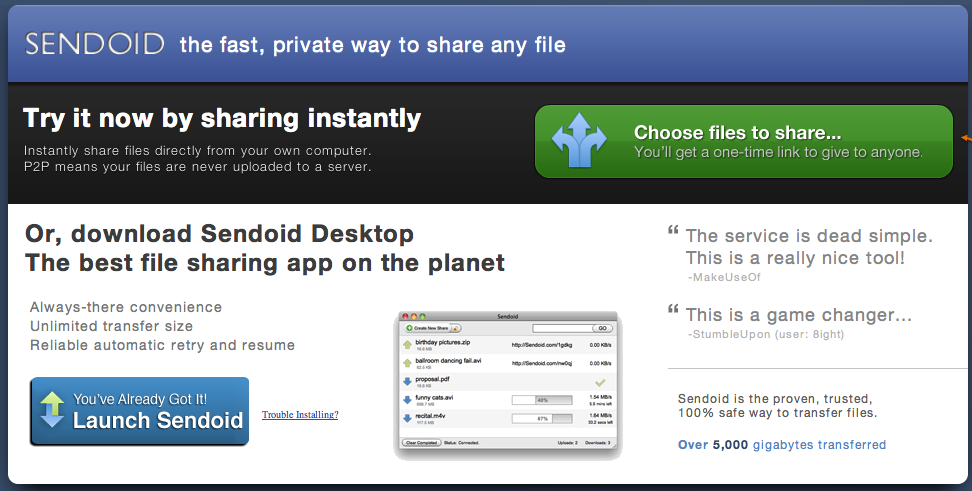 When it comes to sharing videos, music files, or photos, many people simply take to sharing links. Sendoid recognizes this trend and makes it so that, if you want to send a file, all you have to do is go to sendoid.com and select the file you want to transfer from your computer. It will then provide you with a URL, which you can send to the recipient to download. As long as the recipient is online, he or she can then open the link and begin download. Bada bing, bada boom.