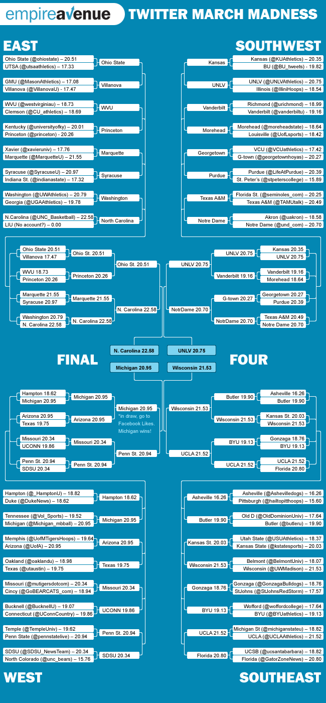 Yes, Empire Avenue has provided us with a full bracket that tells us what team would become the NCAA National Champion were the tournament to be decided by Twitter account activity. Finally! Like a Klout Score, Empire Avenue’s metrics take into account how much activity the school’s Twitter account has, along with the number of followers, replies, retweets, and so on. The metrics prioritize the basketball team’s Twitter account, but in the event the team did not have a Twitter account, they used the school’s Twitter account.