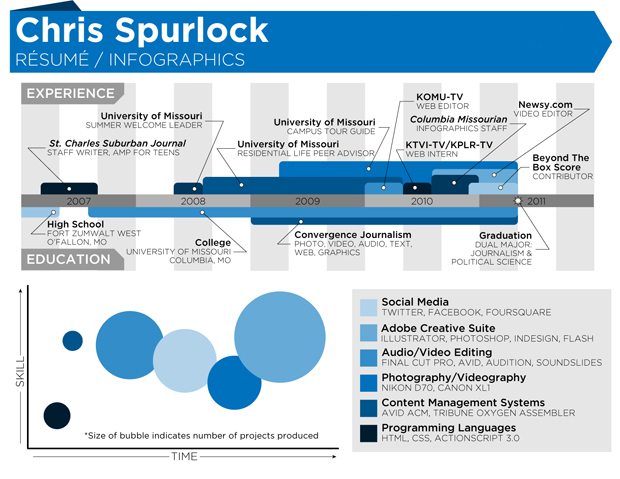 But the most interesting HuffPo new hire doesn’t bring the added name value of an old media publication or any publication for that matter. It’s Christopher Spurlock, a journalism student at the University of Missouri, whose ambitious resume as an infographic was posted to Huffington Post College on February 25th, and proceeded to go viral after Huffington Post Traffic and Trends editor Craig Kanalley tweeted it out to his 5,800 followers.
