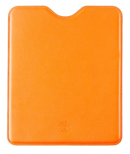 First off, this is silly. $1,400 for an orange leather flap seems a bit dumb to me. Sure, the leather might be from some special barbwire-free cattle that only consumes organic alfalfa hand-picked by the finest Irish leprechauns. Who the hell cares? $1,400 can buy you a couple of houses here in Flint, MI — slumlord or 2 square feet of cow ass? But moreover, how the hell does the case work? Does the leather feature some sort of ratcheting internal structure that supports a tablet? It really doesn’t matter. It’s still dumb just like the cheaper $800 leather sleeve shown after the jump.