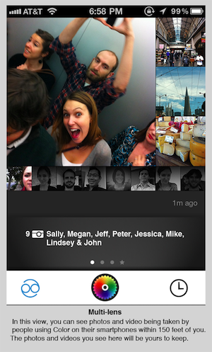 Say you walk into a restaurant with twenty people in it. You sit down at a table with four friends, and start chatting. Then one of your friends pulls out their phone, fires up Color, and takes a snapshot of you and your buddies.