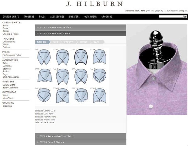 Up until now, J. Hilburn’s website has just directed customers to the style advisors. But today it is extending its reach with a full e-commerce site, complete with shirt and trouser custom configurators for existing customers and where anyone can buy off-the-shelf items online. Once a customer is measured, now he can shop online, or use its iPhone app.