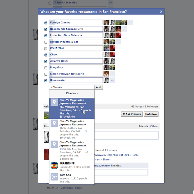 So, as an example, I might ask my friends what their favorite restaurant in San Francisco is. I might pre-populate it with choices like “In-N-Out Burger” and “Tony’s Pizza” — which my friends could vote on — but if someone wanted to add a recommendation that wasn’t already listed they could. Whenever one of my friends votes in one of these questions, my question then shows up in the News Feeds of their friends. In other words, the questions you ask can go viral. The responses from your friends will always be highlighted (you’ll see their faces as small thumbnails) but if you ask a question that resonates with a lot of people, you could wind up with plenty of responses from strangers, too.