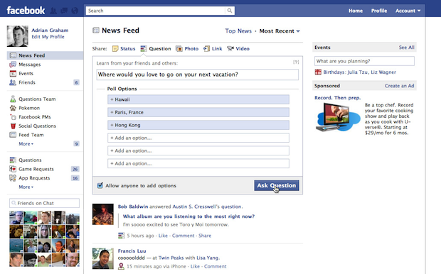 The new version of Questions is less ambitious — you’re no longer directing questions to the entire Facebook community. Instead, it’s much more in line with Facebook’s ‘social’ bread and butter: you ask a question, it shows up as a structured poll in your friends’ News Feeds, and they can vote on the various answer choices or add a new one of their own. In fact, my first reaction to the product was that it might be more appropriate to call it ‘Facebook Polls’.