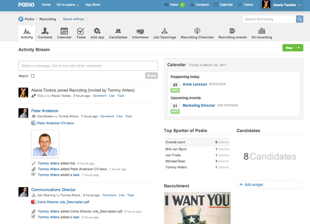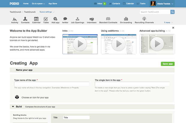 The principle behind Podio is that all work tasks, from expense reports to hiring, happen within the app — And unlike the more social networking focused collaboration platforms, on Podio, you don’t follow users but Spaces. To create a new Space on Podio, click on New Space, name the Space (TechCrunch, for example) and invite users. Each Space comes with baseline fields for Activity, Contacts, Calendar and Tasks and an Add App link at the top left.