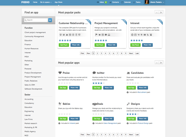 In the Podio App store, users can add App bundles for specific workflow purposes like a CRM Management tool, Project Management tool or individual Apps like like Candidates, an app to manage job candidates, Twitter, an app to monitor tweets and Bugs, an app for internal bug reporting.