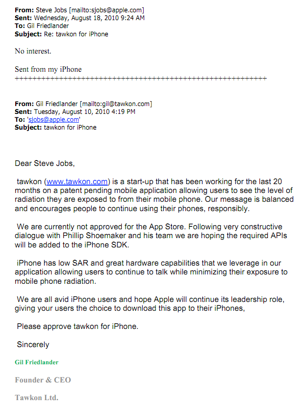 Tawkon sent a courteous email to Jobs in the hopes of gaining approval for distribution of the application through Apple’s App Store, only to receive a characteristically curt response back: