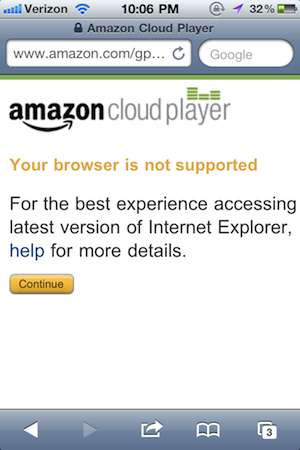Instead, it appears that Amazon may simply be blocking the mobile version of Safari from playing back songs through Cloud Player. When you attempt to load the player, you get a warning that the browser isn’t supported. But you can continue anyway and everything seems like it may be fine. But when you click “Play” nothing happens.