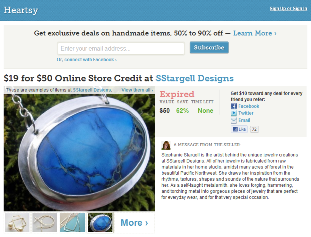 The concept should be overly familiar to you: registered users get sent exclusive deals on handmade items sold on Etsy by email. Acquired coupons, or vouchers as Heartsy refers to them, can be redeemed at the Etsy store that sponsored the deal (example).
