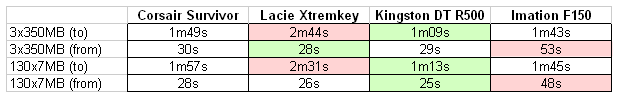 A basic, practical speed test was done, not very scientific, but representative of two normal tasks: copying a few large files (totalling about a gig) and a bunch of smaller files (also around a gig) to and from the drive. All drives were formatted previous to testing. Here’s how they performed: