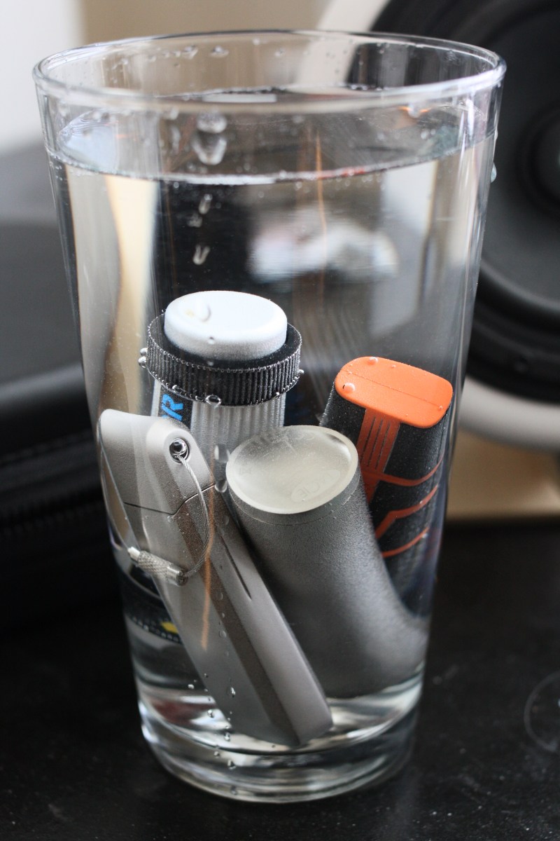 Next, I put the drives into a nice tall glass of water together and let them sit for a few minutes while I wrote up the above. I poured everything into another cup and back, agitated a bit, and generally simulated being dropped in a pool or puddle. The results were mostly the same as above: Xtremkey and Survivor totally dry, R500 had a drop or two. But the F150 was literally full of water. I was especially careful to close it tightly beforehand, in case I had not done so before. But nope, it filled right up.
