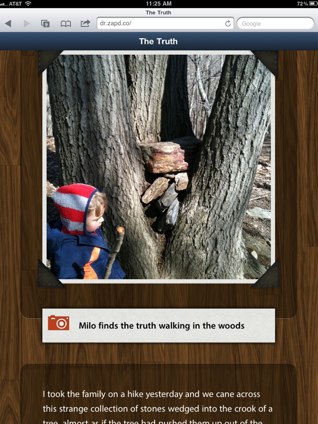 Zapd is an iPhone app that lets you create a themed, well-designed, mobile-friendly website in 60 seconds. You pick a theme, snap a photo, add a caption, and if you want you can even write a little text (don’t strain yourself). When you publish the site or a new entry, you can share a short URL with your friends via Twitter, Facebook, or email. (You can also sign in with your Facebook ID). I tried it and it literally took me a few minutes to create these two sites, Seeking and The Truth.