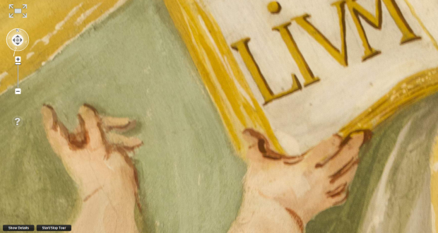 In the screenshot above, in the painting on the ceiling, do you see that angel holding a book, right below the cross? No worries if you can’t, because I zoomed in to give you a close-up: