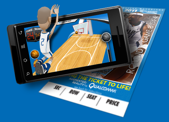 Augmented Reality — or “AR” for those “in the know” — refers to a display in which simulated imagery or graphics are superimposed onto a view of the real world. In the case of these basketball tickets from the future, viewing on your Android will allow you to play an interactive game.