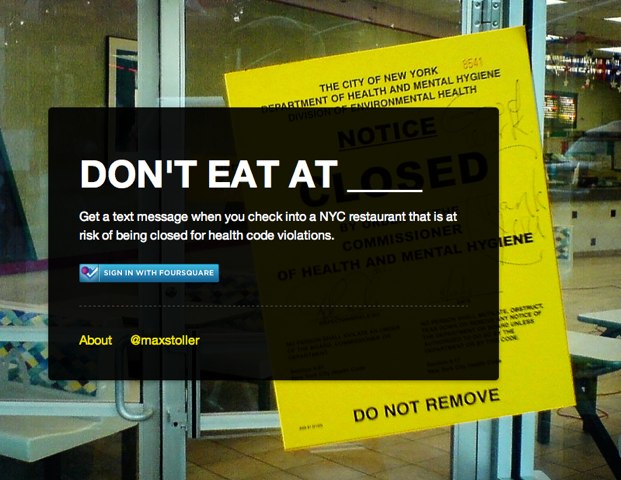 Third place went to Parking Finder, another parking app that maps out parking garages and metered parking spots throughout the city. One of my favorites, however, which won an honorable mention, is DontEat.at, a simple mashup of Foursquare and the city’s Health Department inspection results. Anytime you check into a restaurant that scores above a certain threshold for “serious and persistent violations,” you will get a text message warning you, “Don’t Eat at” that restaurant. Another clever one is Who Is My Landlord?