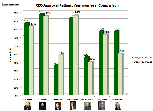 Amazon’s Jeff Bezos and Oracle’s Larry Ellison both dropped four points during the same period to 83 percent and 73 percent, respectively, while eBay’s John Donahoe went on a hot streak. Between March 2009 and March 2010, the eBay CEO held a 24 percent approval rating among employees, whereas between March 2010 and March 2011, he held a 46 percent approval rating. Go Johnny go.