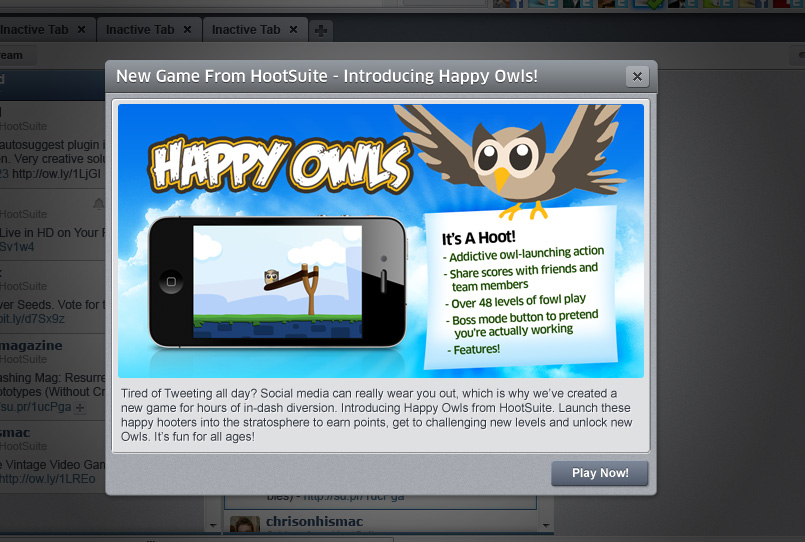 HootSuite has announced a major pivot today. The social media dashboard will be re-launching as a game called Happy Owls. We’re not exactly sure what it is, but we think it has to do with Twitter. Something about happy hooters. We’re not sure how much success this pivot will have, especially considering that, last we heard from The Onion, owls are assholes.