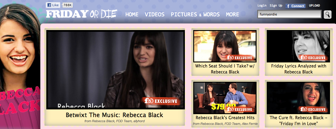 Last year it was Bieber or Die, when the Thing They Call Bieber decided to buy the site and use it as he pleased. This year, Funny or Die has spawned a Rebecca Black version, which is all Rebecca, all the time. Includes such hits as “Betwixt the Music: Rebecca Black”, “The Top 7 Days We So Excited For”, and “Which Seat Should I Take? W/ Rebecca Black”.