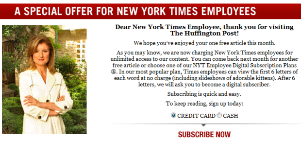 In a message to affected potential readers of HuffPost content, founder Arianna Huffington explains that NYT employees can henceforth access only one article for free per month.