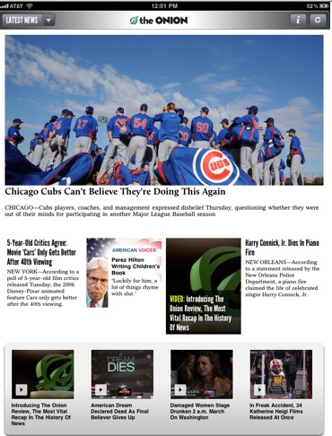 This is not a joke. The Onion, “America’s Finest News Source” (TM), released its iPad app fittingly enough on April Fools Day. IPad apps are serious stuff. This one delivers fake news stories, videos,and images from the parody site in both vertical and landscape modes.