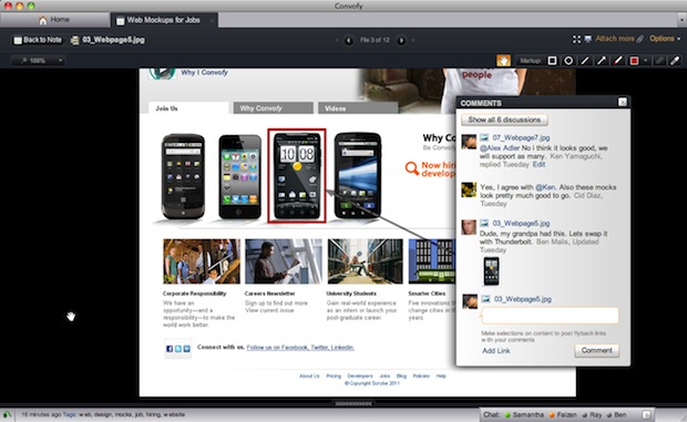 When discussing context, Convofy gives users a Markup tool bar where they can select, underline and drill down into specifics like the RGB and CMK of colors in images as well as comment on their selections.