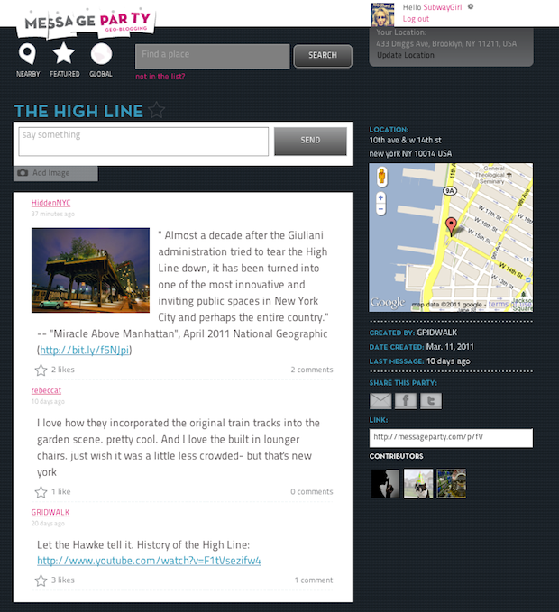 The service is sort of like Foursquare Tips — but instead of leaving notes like “The bathroom code is 1985”, MessageParty is for photos, video, and richer narratives. Say you were wandering through Central Park and you came across some particularly impressive street performers. You might take a YouTube video of them to share with friends, and you could also put it on MessageParty so that anyone else wandering through the park could see it too. In a way, MessageParty is trying to help give physical locations their own multi-media histories.