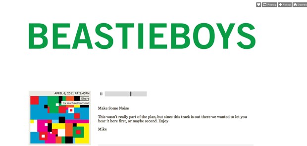 In the past, a rock band might have released a song early on Myspace or YouTube. But now, I guess, it’s all about Tumblr. The Beastie Boys offical site redirects to Tumblr, and even their Facebook page points to the Tumblr post.