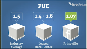 As you can see in the chart below, when measuring in PUE (Power Usage Effectiveness), Facebook’s data center (Prineville) is much more efficient than the industry average (1.07 versus 1.5).