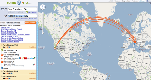 Founders Michael Cameron and Bernie Tschirren tell me that this service was inspired by the European plane versus train dilemma, and a crop of startups searching across multiple modes of travel have popped out of Europe. Oftentimes taking a plane versus a train there can mean a difference of hundreds of dollars. For example a search for Quebec City to Brussels on Orbitz provides you with airport to airport multihop flights that are over a $1000, Rome2rio suggests that you fly to Paris and then take the train, the total trip costing around $400.
