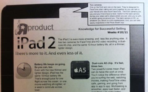 The evidence is plain enough: training documents explaining the specs and selling points of the iPad 2. I’m more surprised they aren’t being trained to play up the kid-oriented titles in the book store, and the many games aimed at young’uns.