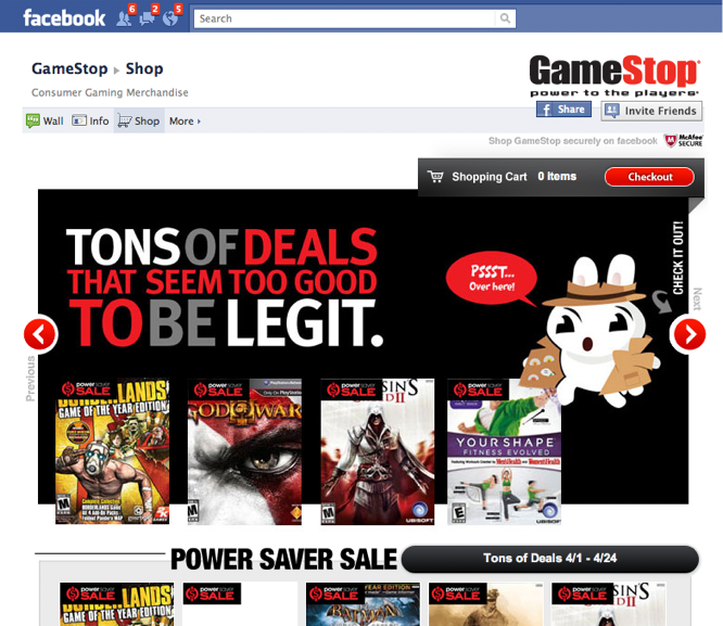 GameStop’s Facebook store features the ability to buy games and view product videos, reviews and ratings, store finders, product carousels, and the ability to like and share products. Fans can purchase “pre-orders” on games for in-store delivery pick up. GameStop’s Facebook store also allows its fans to earn and redeem points when making purchases in Facebook via its loyalty program.