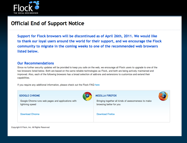 “Support for Flock browsers will be discontinued as of April 26th, 2011. We would like to thank our loyal users around the world for their support, and we encourage the Flock community to migrate in the coming weeks to one of the recommended web browsers listed below.