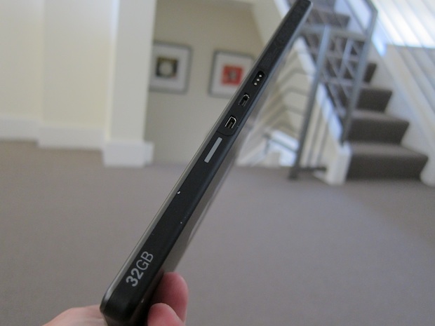 The top of the device also has the standard headphone jack. On the bottom of the device are the inputs/outputs: micro-USB/HDMI and charger/dock inputs.