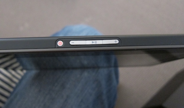 On the top of the device (when held in landscape mode) are the volume controls and a pause/play button. To the left of that is the power button. Let me rephrase that: to the left of that is the awful power button. I can’t for the life of me figure out RIM’s thinking here. The button is so small and very hard to push — I have to use my fingernails. I suppose this prevents accidental hits, but it’s laughably bad.