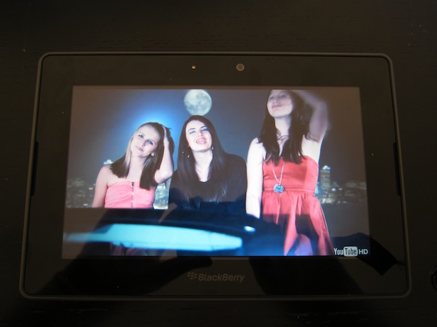 But there are other big bright sides for the PlayBook in terms of performance. One of them is video. The device can handle 1080p video playback with ease. These videos look great on the device and look even better when you use the HDMI-out optional accessory to hook the PlayBook up to your HD TV. It’s pretty amazing that this small machine can power video of this quality. And the really neat thing is that you can do other things in the background on the PlayBook as it outputs this video. It’s impressive for a device that has the same type of dual-core setup as the iPad (though the PlayBook apparently has more RAM).