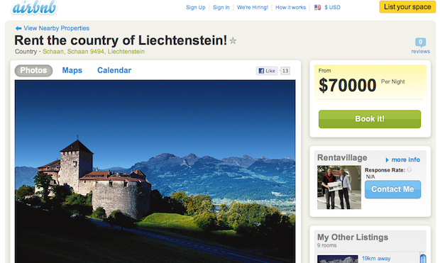 Okay, yes, this is all more or less a cute marketing idea — you won’t actually be able to evict the 33,000 other people that live in Liechtenstein, for example — but it’s awesome and genius. Airbnb has teamed up with Xnet, a Liechtenstein based event production and marketing firm, to make this happen, Airbnb co-founder Brian Chesky tells us.