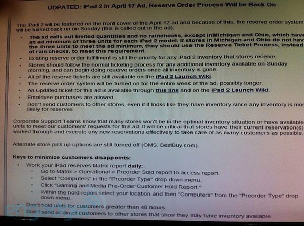 Will it be a crazy price? Free accessory? Or will they simply say “we’ve got ’em, come and get ’em”? It isn’t clear from the memo (leaked to Engadget) seen above. But they’re not manufacturing scarcity — the scarcity is real, and some stores will only have a handful to sell. If you’ve got one on reserve, this would be a good time to drop by, as stores should have inventory and this memo directs people to fulfill previous orders first.