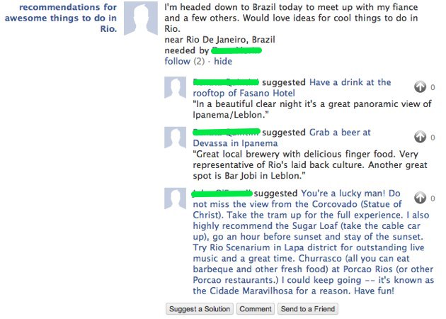 There’s a lot more to it than that. In particular, on the back end a lot of the free text people are typing in is being structured and organized. If a lot of people are talking about “Acme Sushi,” it’s going to get auto linked to a page with information about Acme Sushi. You can see the evolution of this in process in the teaser screenshot above, where the entire last answer is a link instead of just parts of it. But overall, it works really well.