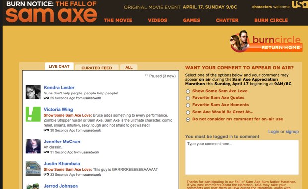 TV is just not the same without Twitter and Facebook chatter. Tonight’s prequel movie Burn Notice: The Fall of Sam Axe comes with social chatter about the show on your laptop courtesy of Echo, the realtime commenting system. The USA Network launched this companion site, which pulls in comments, Tweets, Facebook status updates and Fan Page comments, as well as YouTube video and Twitpic photos about the show.