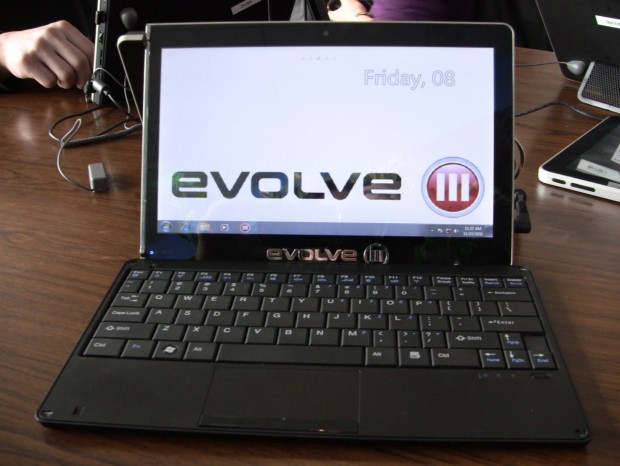 The Maestro S (being shown off at IDF Beijing) has a new 1.5GHz Atom Z670, 2GB of RAM, and 32 gigs of SSD storage. Its built-in accessories include a full keyboard and trackpad, plus a big ol’ kickstand there on the left side. It looks chunky as hell, but they’re claiming 16 hours of battery in Android and 10 in Windows 7.