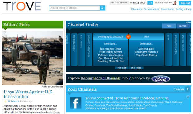 Trove takes advantage of Facebook Connect to pull in a user’s interests as outlined by his or her Facebook profile to help jump start the personalization part of the equation.