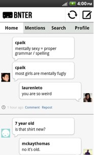 The Android app (which works on OS 2.1 or higher) is similar in functionality to its iPhone cousin and the web app, and allows you to read your feed of conversations and people you are following, comment, search and add conversations. And because it is a mobile app, Bnter for Android can pull your text message stream into the app so posting is fairly easy.