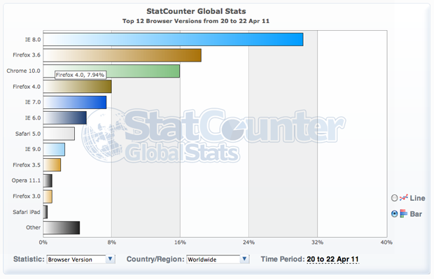 When compared to the percentages two days after its launch it looks like Firefox 4 has taken a solid chunk out of Firefox 3.6 usage: On March 22 IE had 45% of the global market, followed by Firefox 3.6 with 30% and Chrome with 17%. Firefox 4 was at 1.95% then.