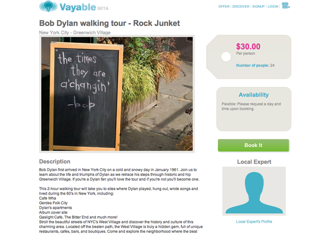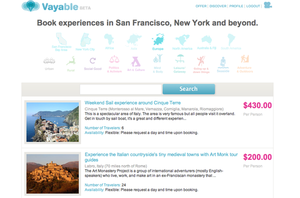 Wong and Samrat actually met on Airbnb themselves and were roommates for about two weeks when they came up with the idea for Vayable, attempting to provide a solution to the “what do I do once I get there?” travel problem. The service currently has a modest 200 users, but there are still plenty of interesting things to do on Vayable, including a taking Bob Dylan Walking Tour in NYC, joining a local king on a fishing trip in Fiji or indulging in a weekend sailing experience around Cinque Terre in Italy.