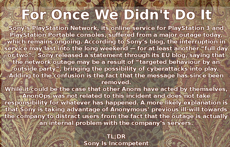 However, AnonOps (Anonymous Operations), the group’s mouthpiece and network through which members frequently communicate, has adamantly stated via its news wing that it was not responsible for the outage. Though, it seems that this particular announcement was made prior to Sony delivering the news that the problem was in fact due to hacking. So, Anonymous pointing to Sony’s incompetence as the cause of the outages is off base. Sort of.